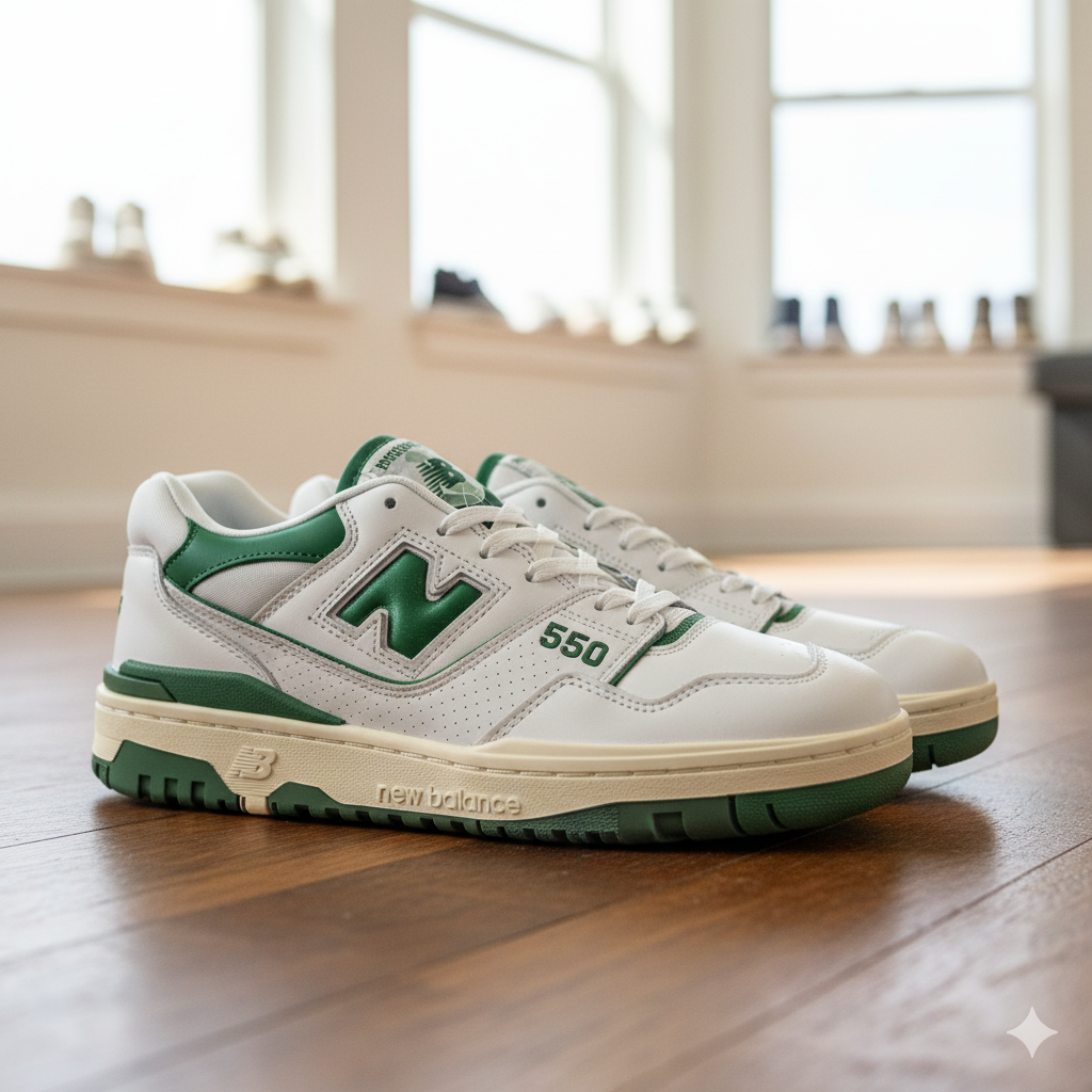 Vintage-inspired New Balance 550 in white and green, thrifted and in very good condition.